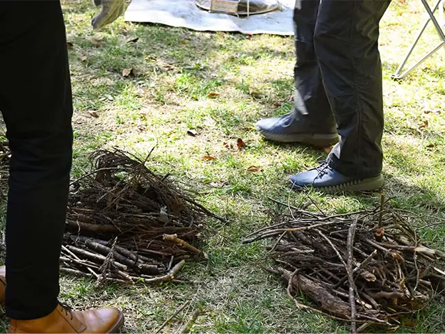 森の中で資源を調達したら、自分たちで焚き火を作っていきましょう。自然に負荷の少ない、環境にやさしい焚き火の作り方をお伝えします。