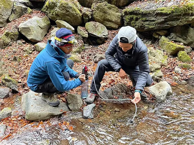濾過装置を使って、川の水を安全な飲み水にする体験を一緒におこないます。調達した水は、焚き火にかけて、お湯を沸かし、インスタントスープをいただきましょう。