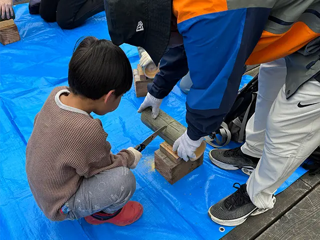 枝を落としたり、丸太を切ったり、親子で協力して、「倒木」を「木材」にしていきましょう。