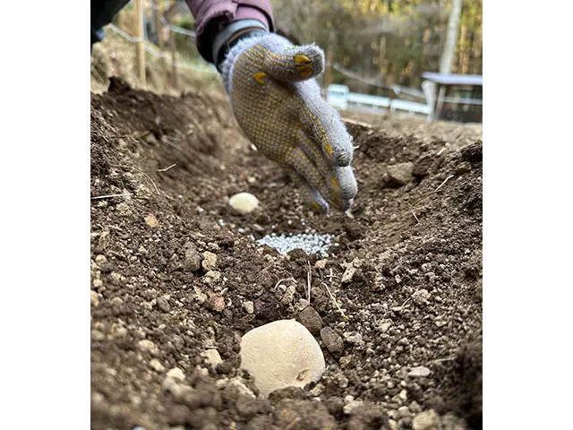 午後は、里山を活用するために先生方が耕した畑に、じゃがいもの種芋を植えていきます。