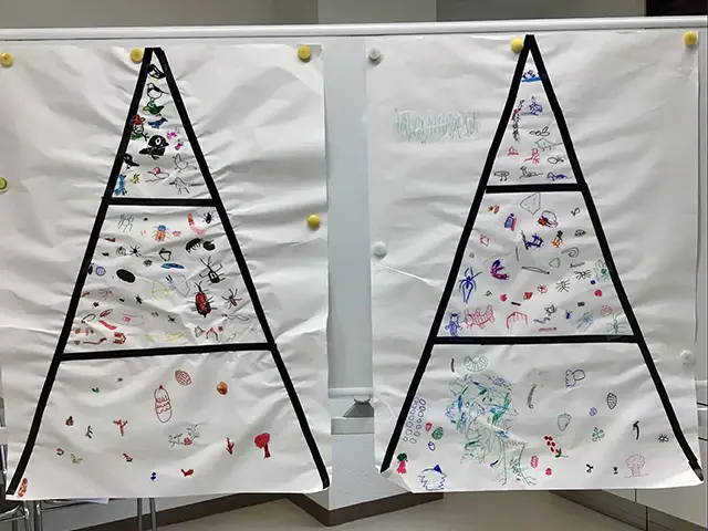 当日お配りするスケッチ用紙はシールになっているので、大きな用紙に記載したピラミッドに、食物連鎖の生態系を考えながら、自分たちのイラストを貼り付けていきましょう。
