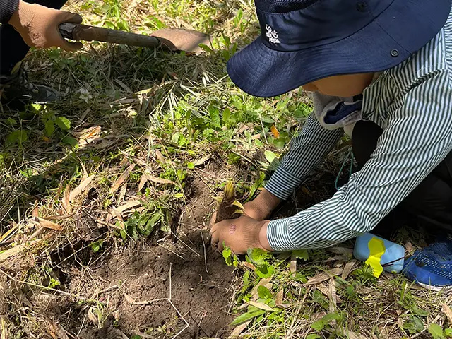 筍を見つけたら、自分の力で筍堀りにチャレンジしましょう。現地には、異なるサイズのスコップや鍬(くわ)など、色々な道具を用意しています。