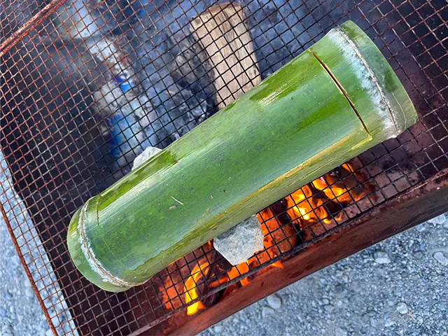 竹飯盒に用意した食材と水を入れたら、自分で竹の蓋をして、焚き火にかけてワイルドにお米を炊く「炊爨(すいさん)」体験をします。