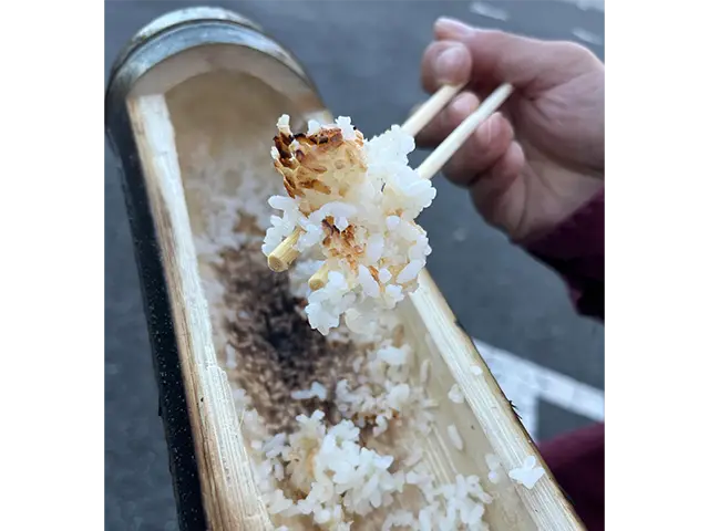 炊き上がったら、竹飯盒を食器にして、できたてほかほかの「筍ごはん」をいただきましょう。
